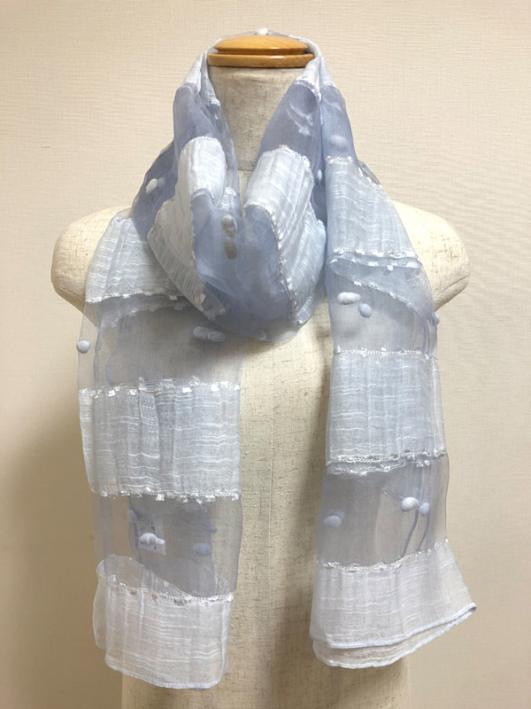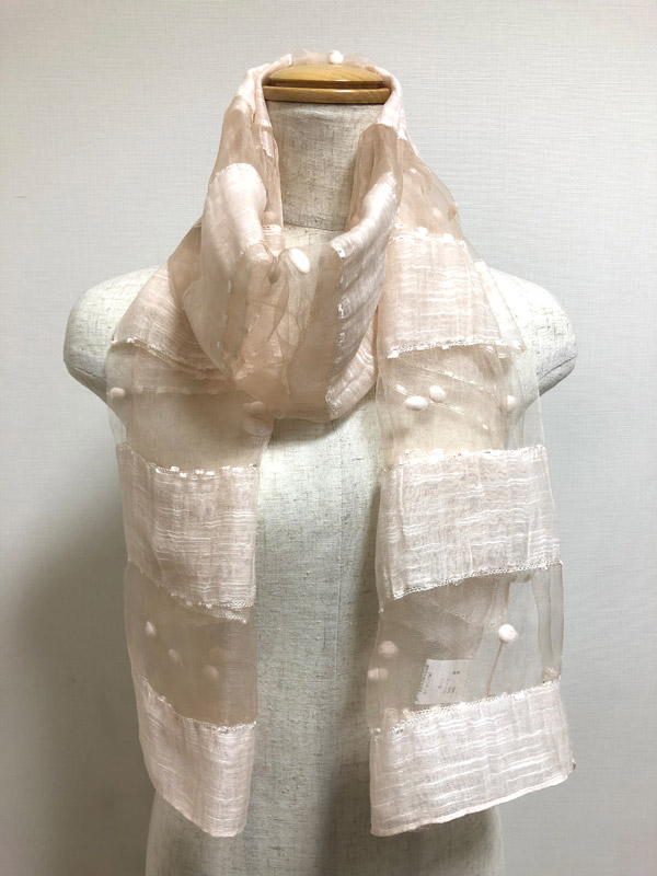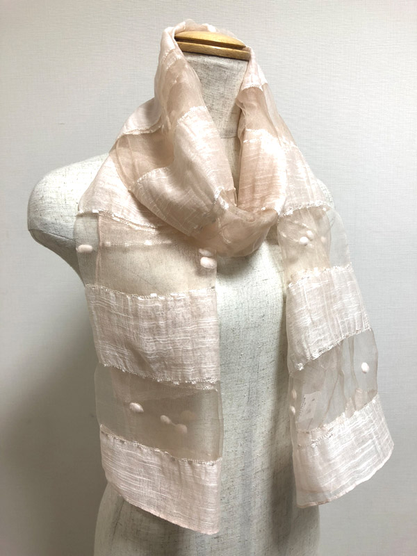 《シルク&コットン》 透け感のあるボーダー織りにシルクの糸玉があしらわれたストール 3色